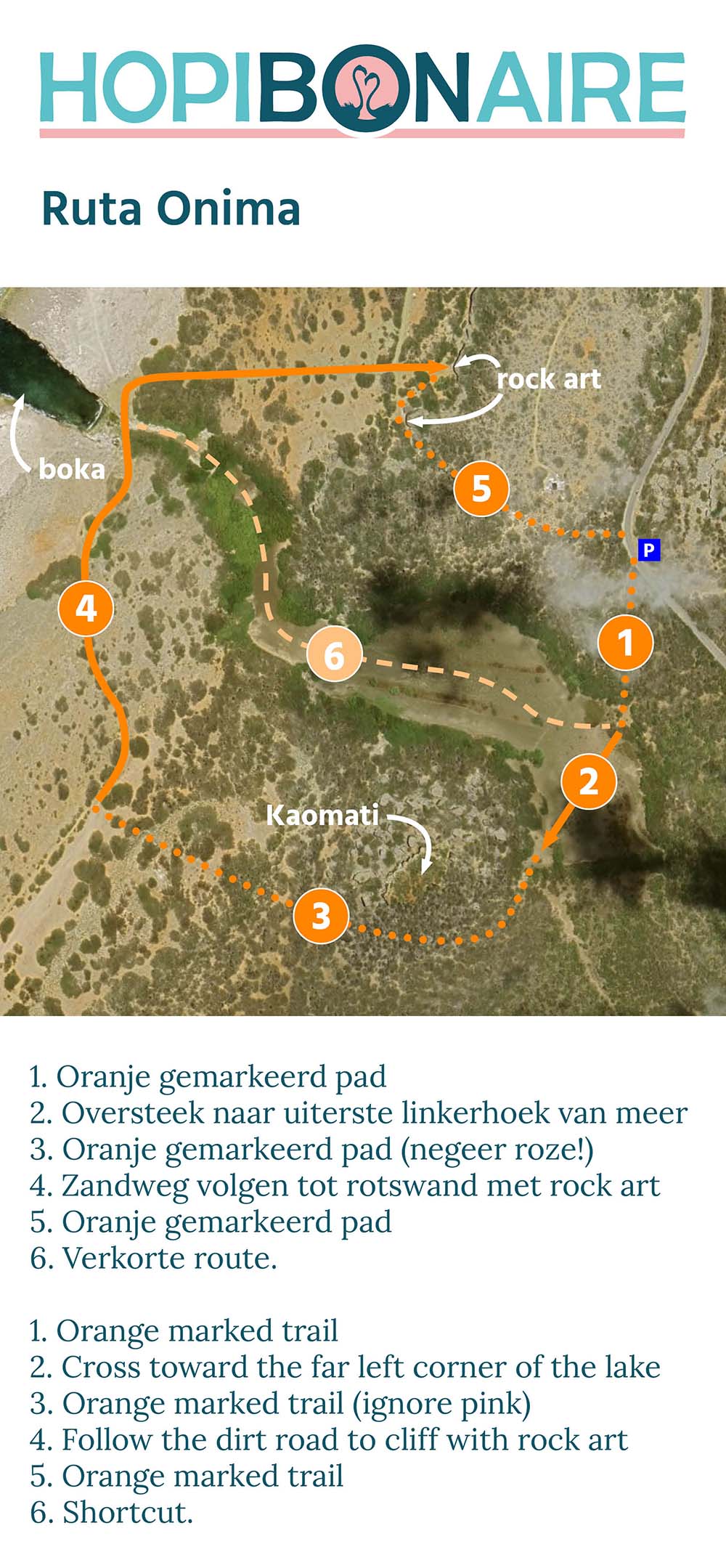 Als je het meer bent overgestoken, loop je met de klok mee om de Kaomati. Het pad slingert speels langs de grote brokken kalksteen die van de heuvel zijn gerold. In het noorden laat je de heuvel achter je en loop je richting de ruige oostkust. Via de indrukwekkende Boka Onima bereik je bij de Rotstekeningen van Onima. Daar vind je een smal pad dat over een met cactussen begroeid terras terugloopt naar het beginpunt van de route.